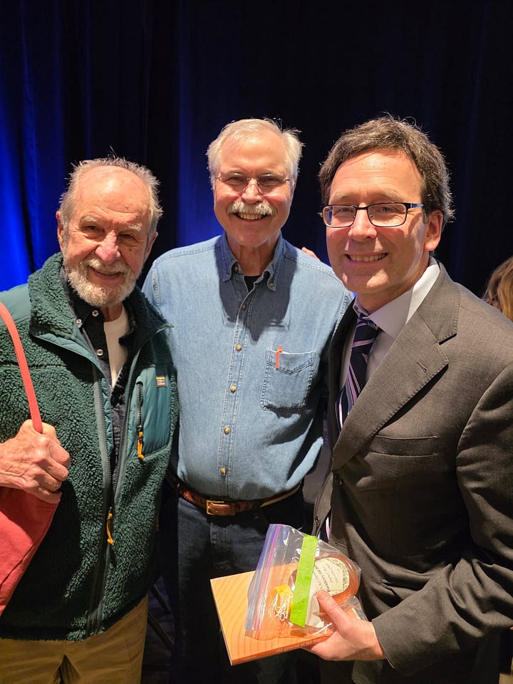 Dad and his tree-farming friend Merc Boyer went to a fundraiser for Governor Bob Ferguson last week. Their goal was to raise the governor’s awareness about small forest landowners in Washington State. Note the jar of honey and book in the governor’s hand. The honey is from the bees gathering nectar on Merc’s forestland, and the book is my Ground at My Feet, with a letter from Dad explaining why the new Department of Natural Resources rule expanding no-harvest buffers on non-fish streams is a bad idea.