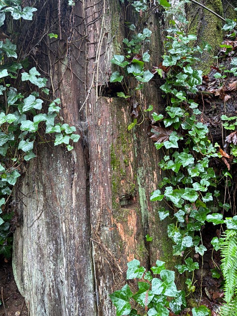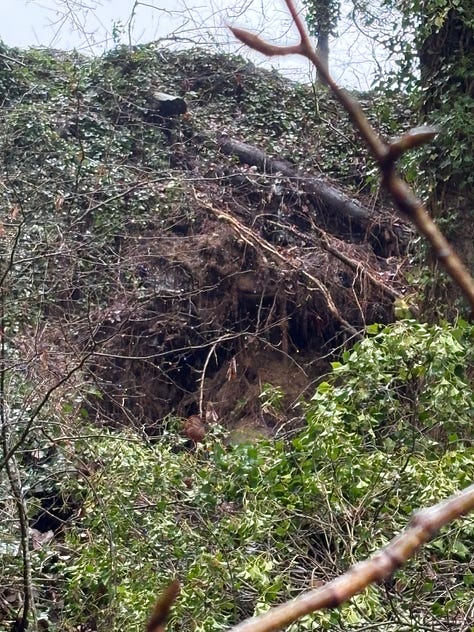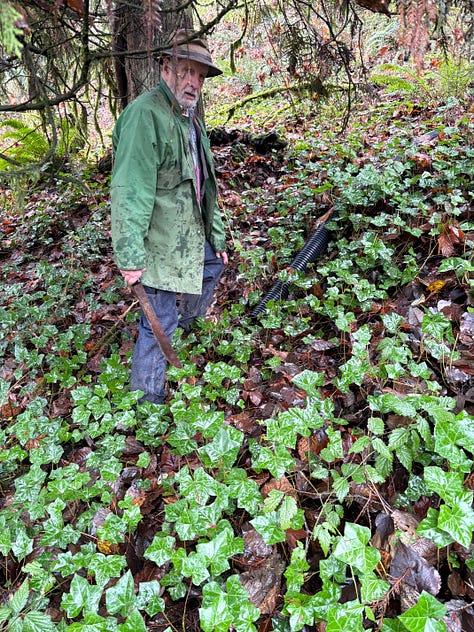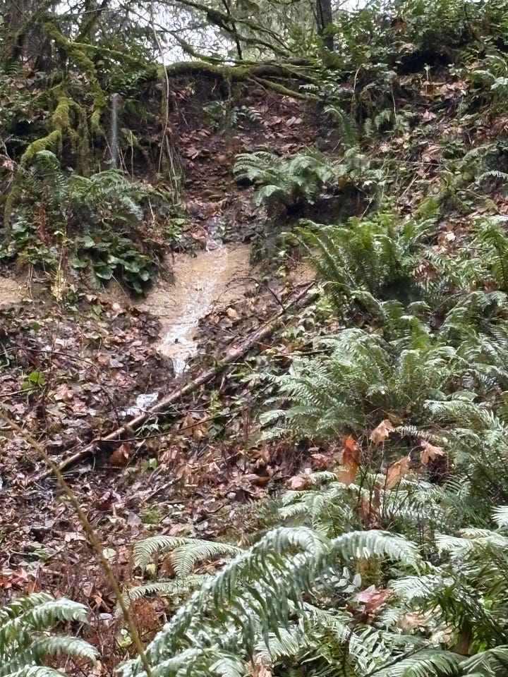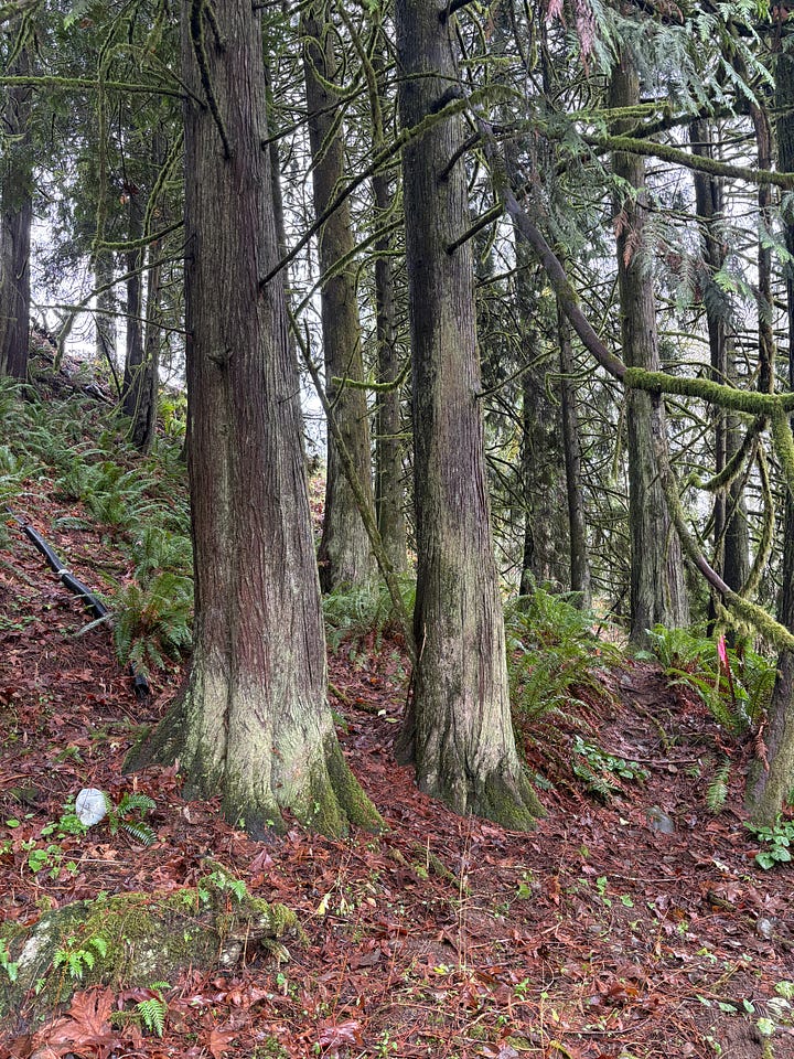 Dad and I walked along our bluff and below the house to see if there was any blowdown (found 2) and to check the flexible pipes connected to our gutters. We freshened up the property line with pink flagging, macheted some brush, admired the cedar trees, and noted the double spring board notches in an old-growth stump. Water was running over the cliff exposing the soil layers—we could clearly see the layer of clay under our one foot of topsoil and gravel. Proof of our “droughty” site.