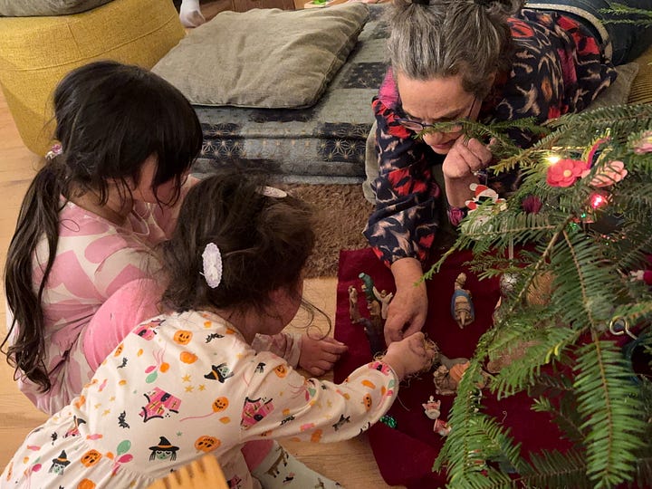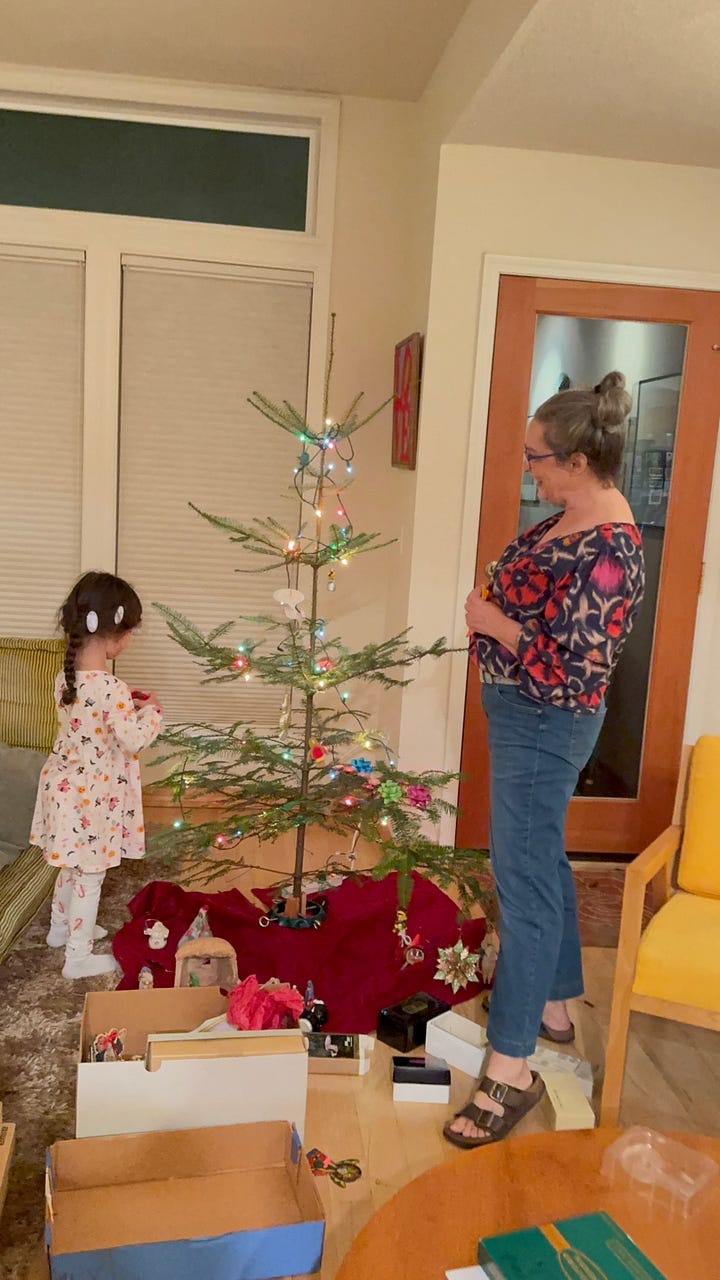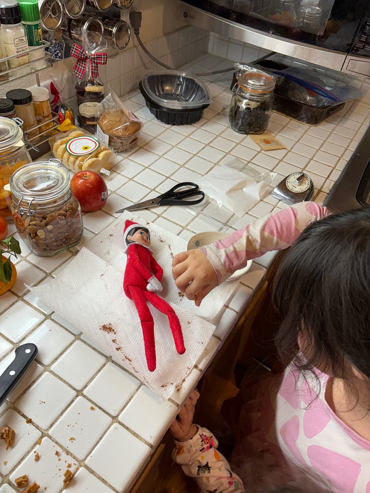 The Lottering Family came to help decorate our tree. Akane and Abby brought Mrs Frazzle, their Elf on a Shelf. It seems that if a human outside the FAMILY touches Mrs Frazzle, she loses her powers. In order to regain them, she must be surrounded by a sprinkle of cinnamon. Akane gave me Mrs Frazzle to hold, so the cinnamon ritual had to be performed before they left. Just before they left, Tom mistakenly touched Mrs Frazzle! Abby gave him a look that could wither any human being and the cinnamon came back out. I LOVE the playfulness of this family.