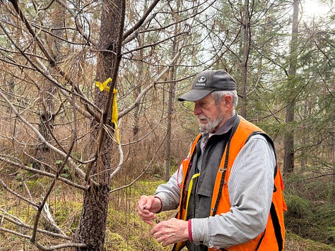 Dad and I took 15 plots today in our to-be-thinned Willamette Valley Ponderosa Pine stands. Each plot is 1/50 of an acre. We marked a center tree with yellow ribbon, then counted each tree within a 16.7’ foot radius using a “log tape,” a metal measuring tape that hooks onto your belt and has a hook at the end to stick into a tree if you’re working alone. We currently have about 350 trees per acre and want to end up with 250 trees per acre. In each plot we chose which trees will be cut and marked them with pink ribbon.