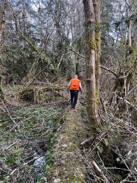 I love being out in the woods with Dad—he notices the coyote scat, scotch broom, and talks about the trees like each one is his friend.