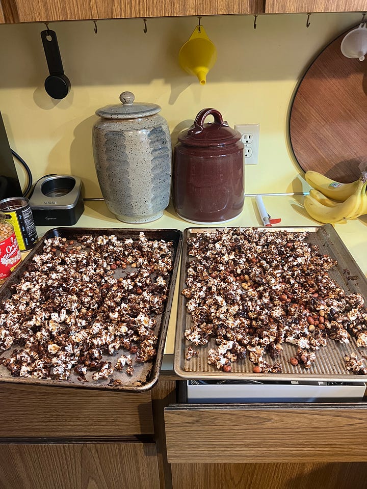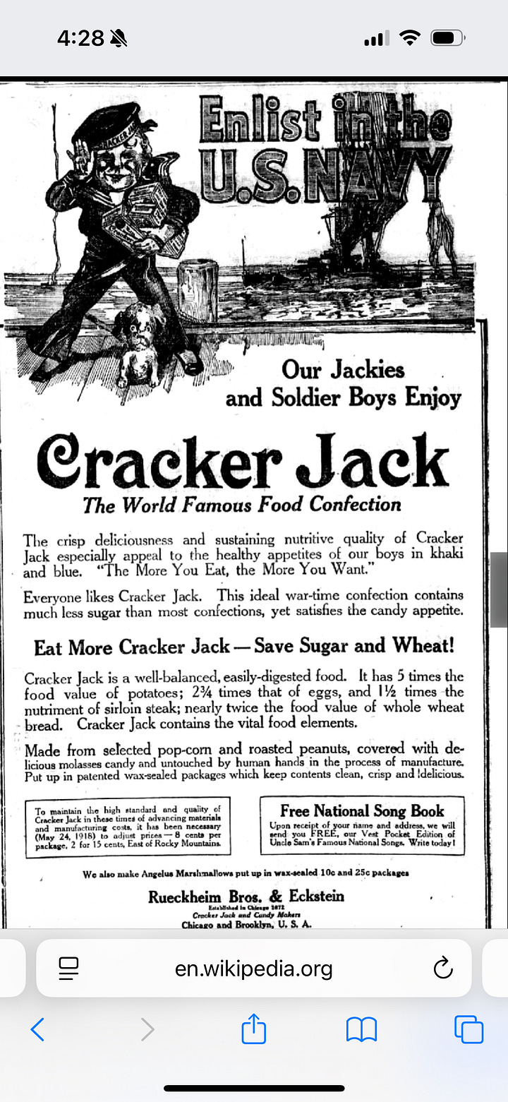 For her birthday, Mom requested deviled eggs, carmel corn, and music by Joe Batt, a musician and ceramic artist Mom loves. We had big plans for a party, but Mom started feeling poorly (weak, weary, and worn out) so we had to cancel. But Lois came with deviled eggs (did you know they’re called deviled because they’re made with spices like paprika—and that in the Bible Belt, one should say “salad eggs” or “stuffed eggs.” )And I made cracker jack—a version of carmel corn made with molasses and peanuts. I even found a stash of small magnets I wrapped in wax paper and used for prizes. And I found the WWI era ad for Cracker Jack about—I love that it was considered a “well-balanced and easily digested food.”