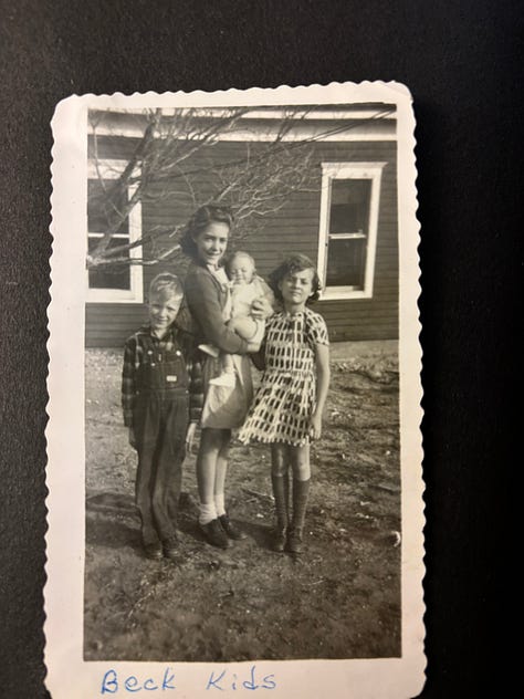 Mom turned 92 on Thursday. Her brother Bob and sister Lois came to visit— hat’s almost 300 years of life lived between the three of them. The photo of them on the horse was taken at their paternal grandfather’s farm near Clayton, New Mexico. In the other photo, Mom is holding their baby sister Ann, who was often sickly and died at age 8 after getting measles and chicken pox.