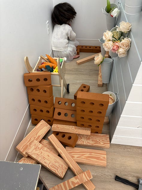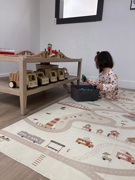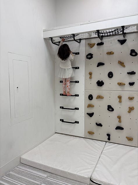 My dear friend Yoko was feeling unwell last week, so I took Abby on an outing. I trepidatiously suggested we go to one of the many trampoline places (so noisy), but she rejected that offer, saying “hand me your phone.” She scrolled around and found a place called Happy Baby Play in Beaverton—she had never been there, cannot read yet—and we went. It was great. Quiet, and hours of creative activity.